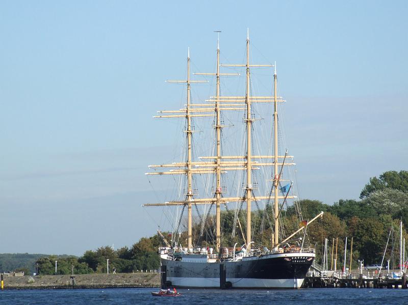 Auf diesem Foto sieht man die Viermastbark Passat, die in Travemünde als Museumsschiff liegt. Sie lief 1911 vom Stapel und war bis zum Jahr 1957 als Frachtsegelschiff zwischen Europa und Südamerika in Betrieb. Ihr Schwesterschiff Pamir ging 1957 in einem Hurrikan unter, wobei der größte Teil der Besatzung ums Leben kam. Das Schwesterschiff Padua fährt heute noch als das russische Schulschiff "Krusenstern" zur See.